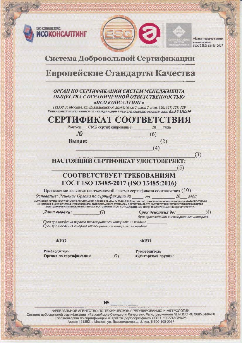 -Сертификацию систем менеджмента качества на соответствие требованиям стандарта ГОСТ ISO 13485-2017 «Изделия медицинские. Системы менеджмента качества. Требования для целей регулирования».